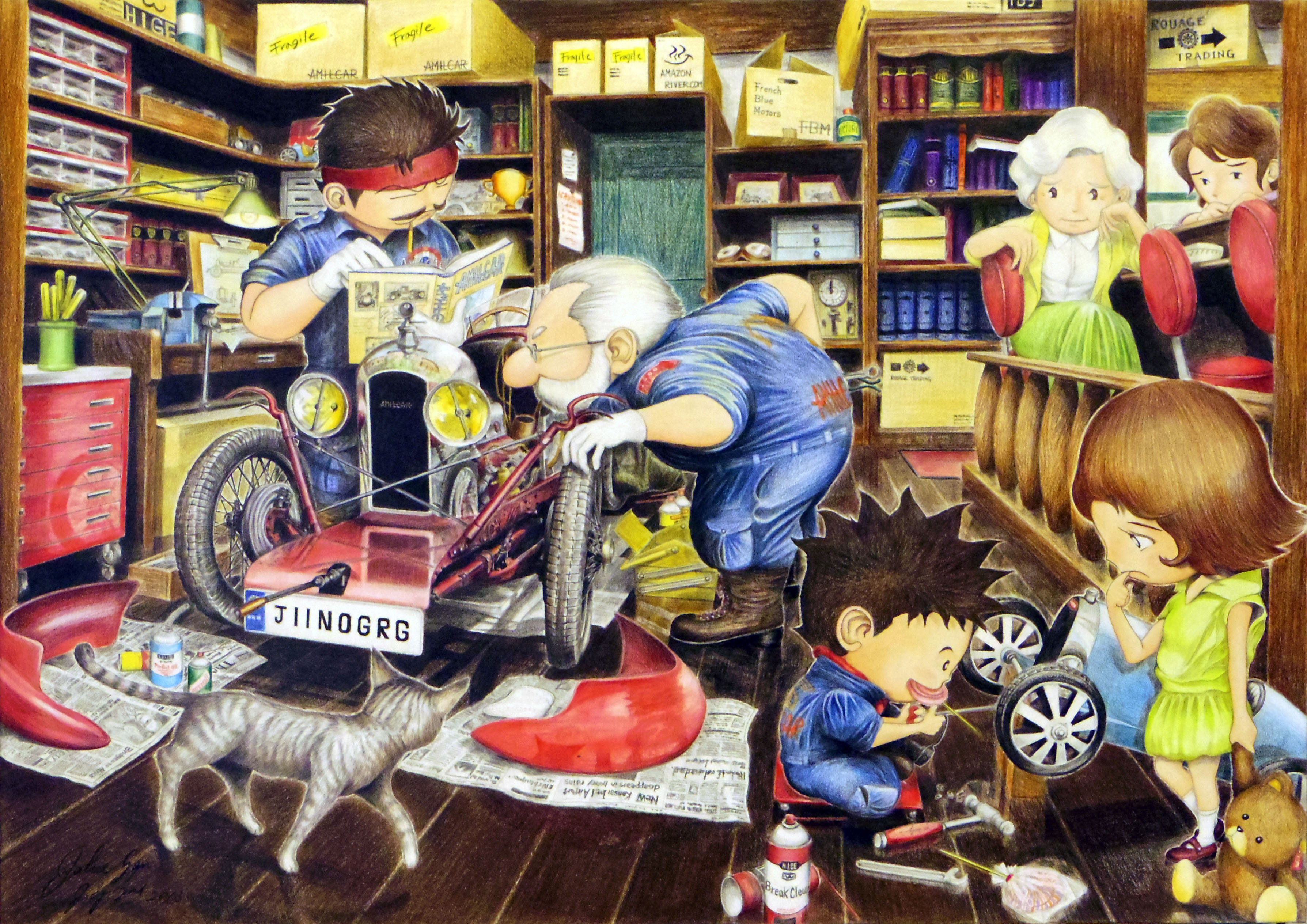 「ねえ、遊びにいかないの?」 でも、ボクはクルマに夢中おとうさんもおじいちゃんも エミールの修理に没頭中