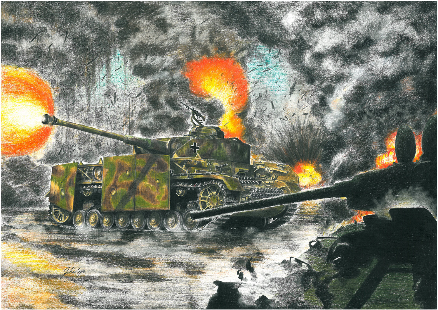 モデルはⅣ号戦車シリーズのH型で、手前で破壊されているのはソ連のT34/85です。